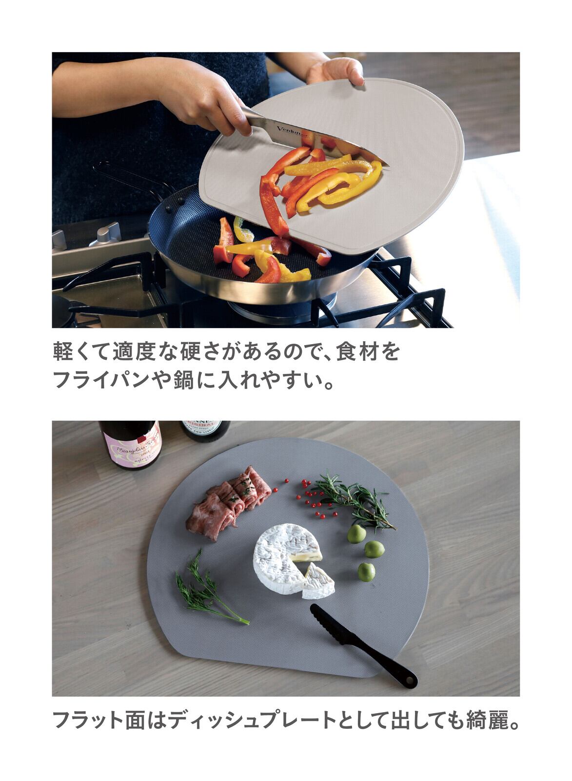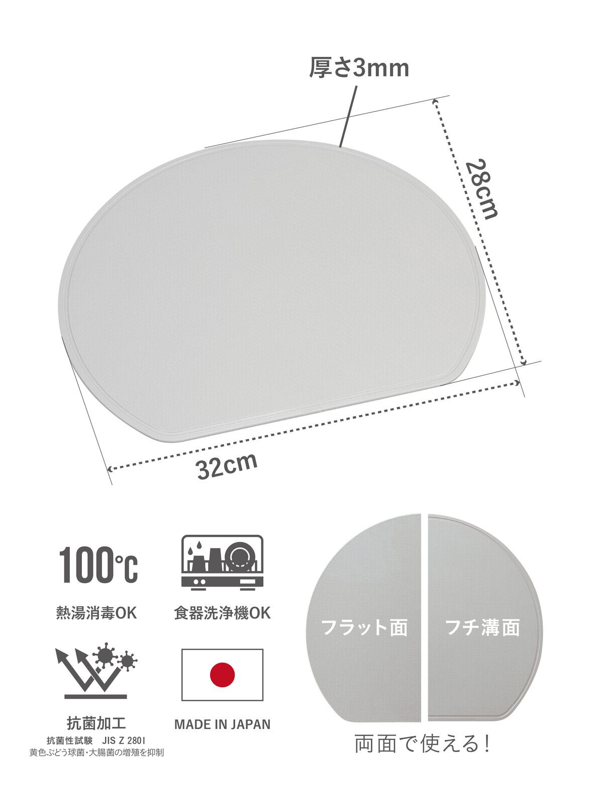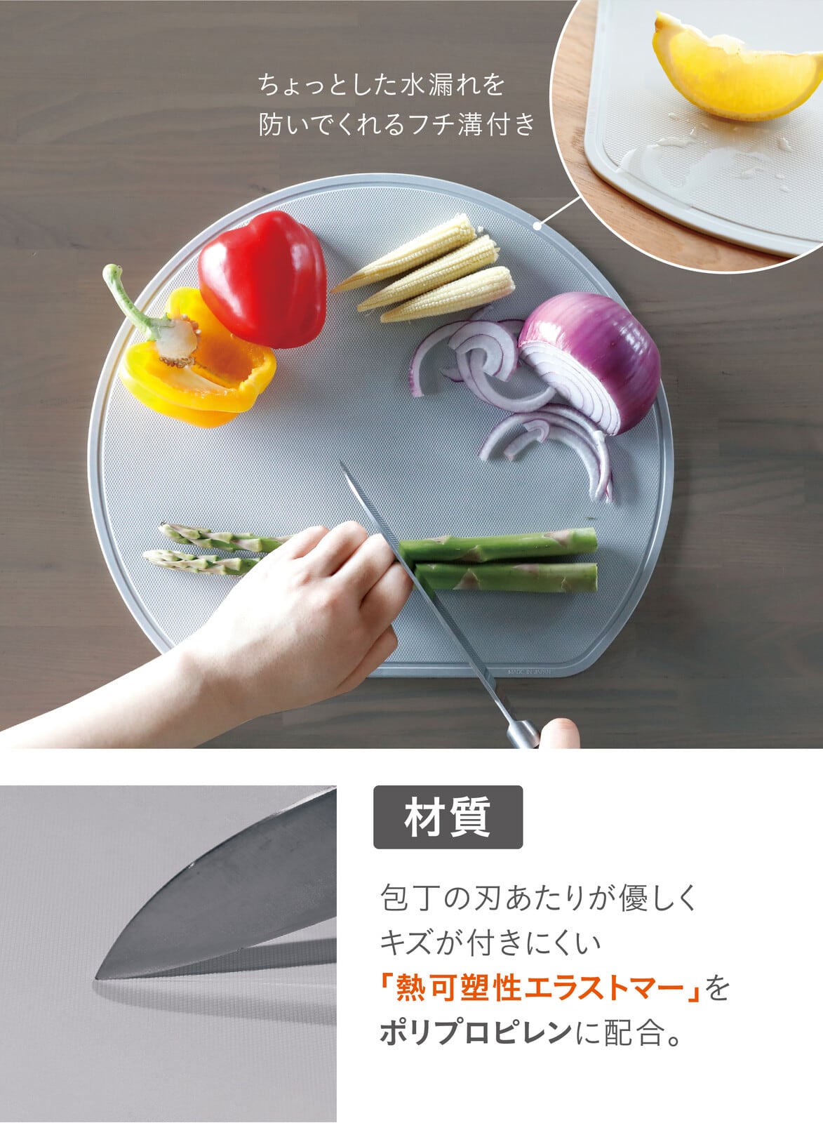 丸型の手前部分をカットした「スペースを無駄なく使える半月まな板」長方形のまな板に比べて面積が広く奥行きがあるので、切った食材をまな板上部に置いたまま他の食材をカット出来ます。シンプルかつ実用的なデザインで一人暮らしにもおすすめ。溝がある面と溝が無くフラットな面の両面使える仕様なので、切る食材で分けることも可能です。毎日の料理からキャンプやバーベキューなどのアウトドアまでお使いいただけます。ポリプロピレンに「熱可塑性エラストマー」が配合されているので、適度な硬さと程よい弾力があるのが特徴。包丁の刃あたりが優しいので、食材が切りやすく刃こぼれを防ぎます。まな板自体にも深いキズが付きにくいので安心です。切り終えた食材を載せたまま、複数の食材をいっぺんに切れるので、省スペースでも扱いやすいです。軽い(約216g)ので、食材を移すときも扱いやすいです。使わないときは立てて収納することができます。お手入れは食器洗浄機や熱湯消毒ができるので、清潔にお使い頂けます。抗菌仕様なので菌が繁殖しにくく、毎日清潔にお使い頂けます。抗菌性試験:JIS Z 2801