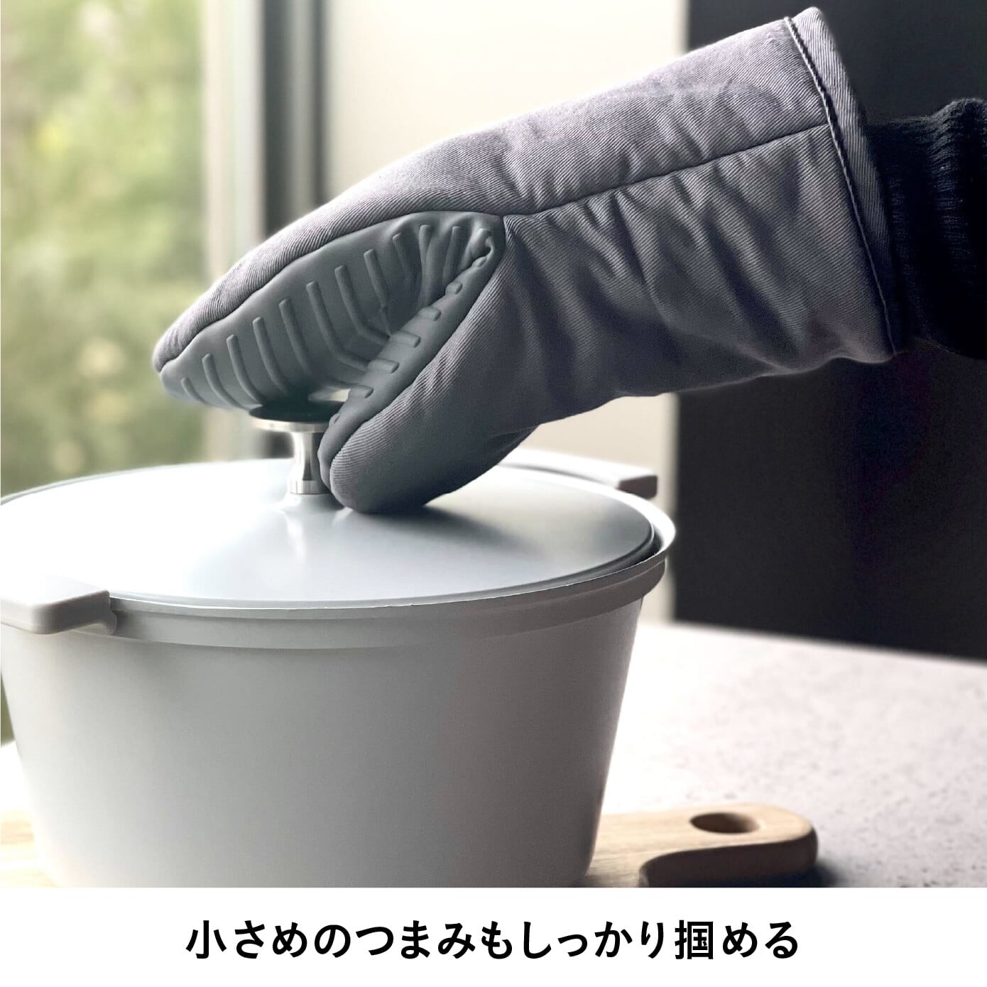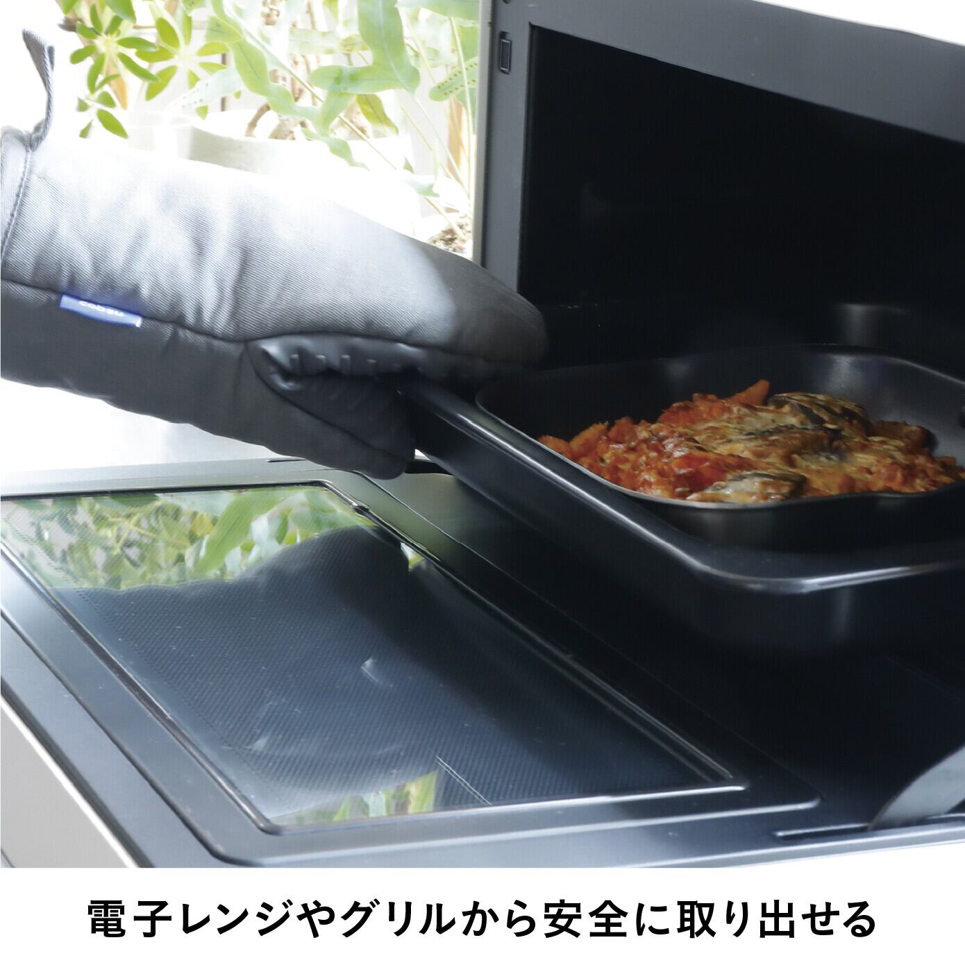 『コパン 蒸れにくいシリコン&コットンミトン』はミトンの掴む部分がシリコン製で滑りにくく、小さなつまみもしっかり摘める構造です。快適なフィット感で安全に調理をサポートします。