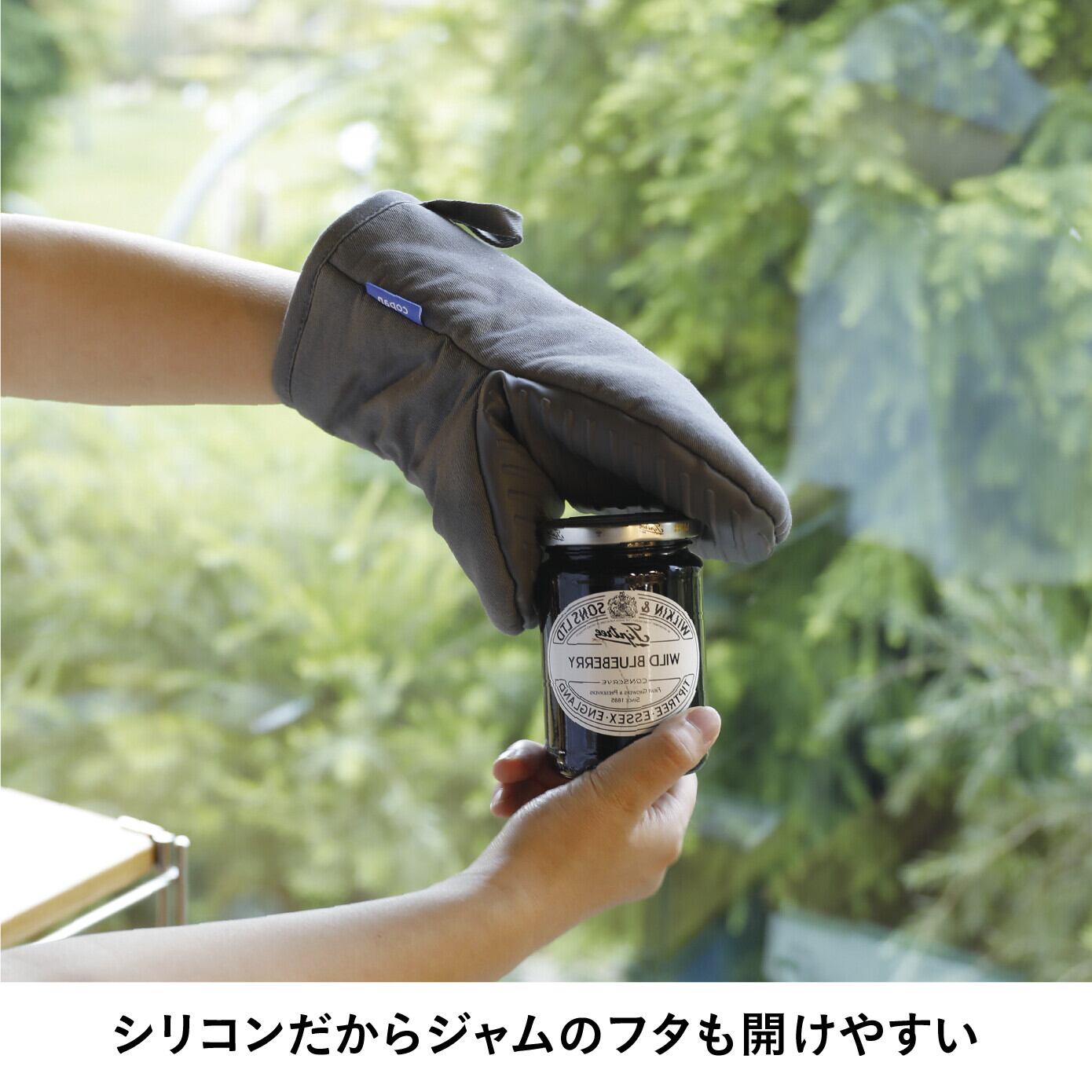 掴む部分がシリコン製なので滑りにくい『コパン 蒸れにくいシリコン&コットンミトン』。シリコン部分は耐熱温度が220℃もあるため、どんなに熱い鍋やフライパンでも安心して持ち運べます。外側は綿素材なので通気性がしっかりしており、蒸れにくいのもポイントです。シリコンの滑りにくさを活かして、鍋つかみとしてだけでなく、硬い瓶のフタを開けるときにも便利です。